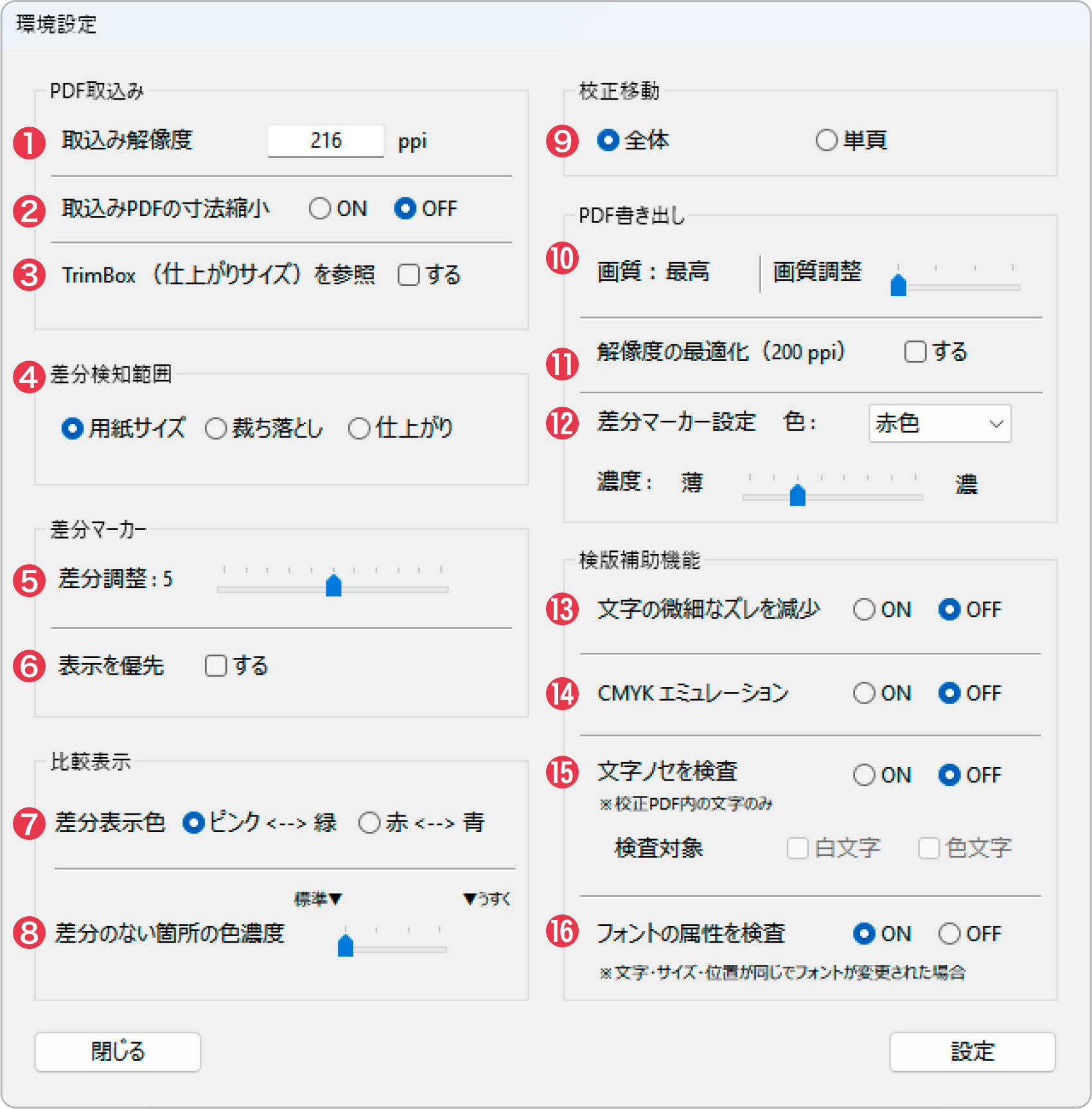 PDFの取り込みや差分表示の色や範囲や濃度など、比較するPDFに合わせた各種設定を行います。設定変更は比較作業途中でも反映されるので、設定変更後、原稿を再度取り込み直す必要はありません。