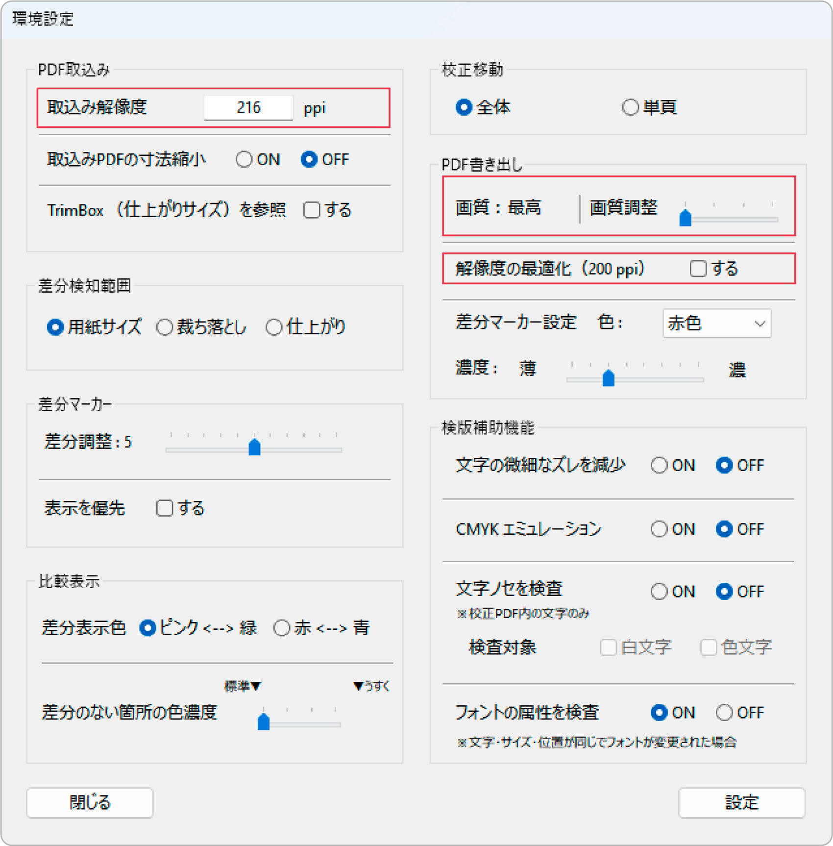 書き出すPDF(比較保存・検査レポート)のファイル容量は、[環境設定]の[取込み解像度]、[画質]、[解像度の最適化(200ppi)]の3項目で調節することができます。